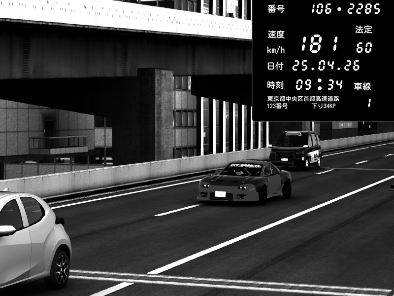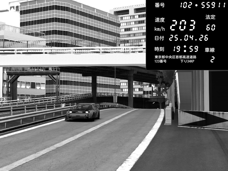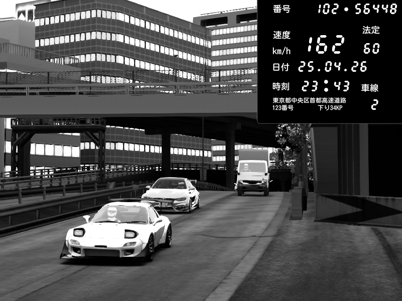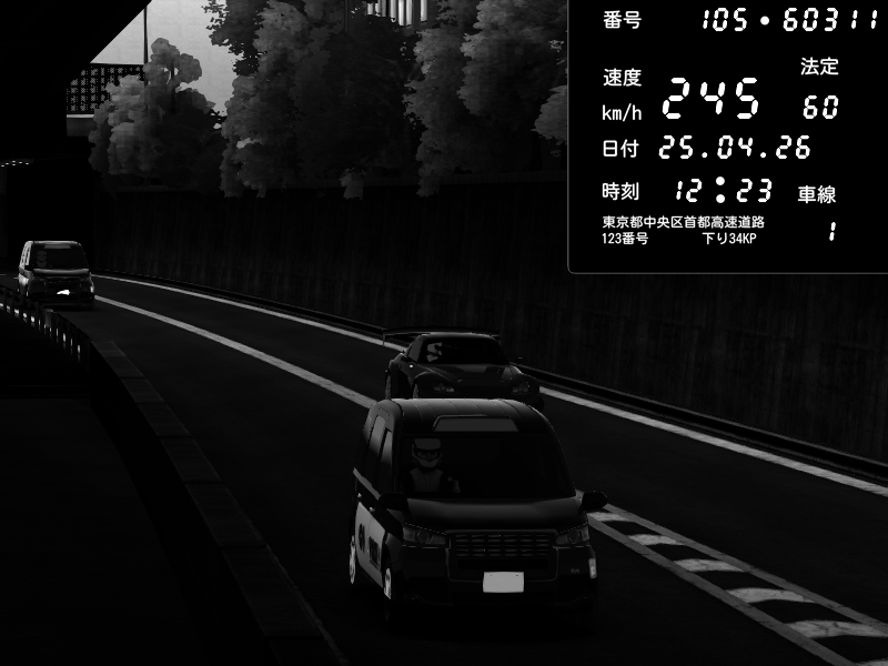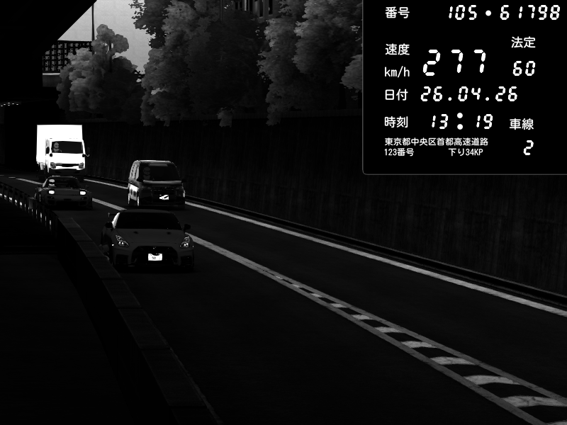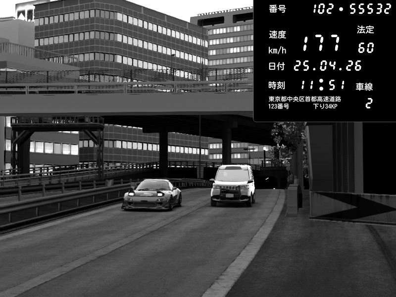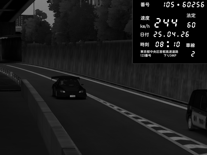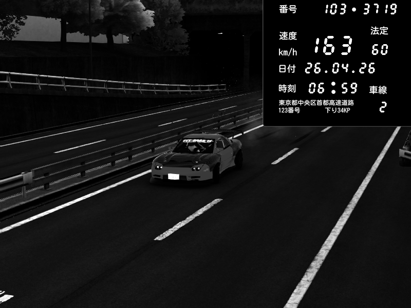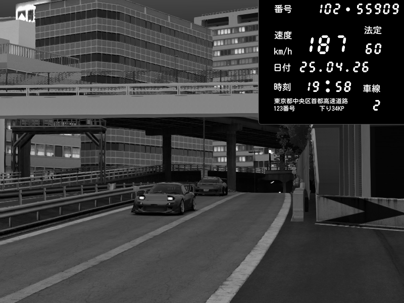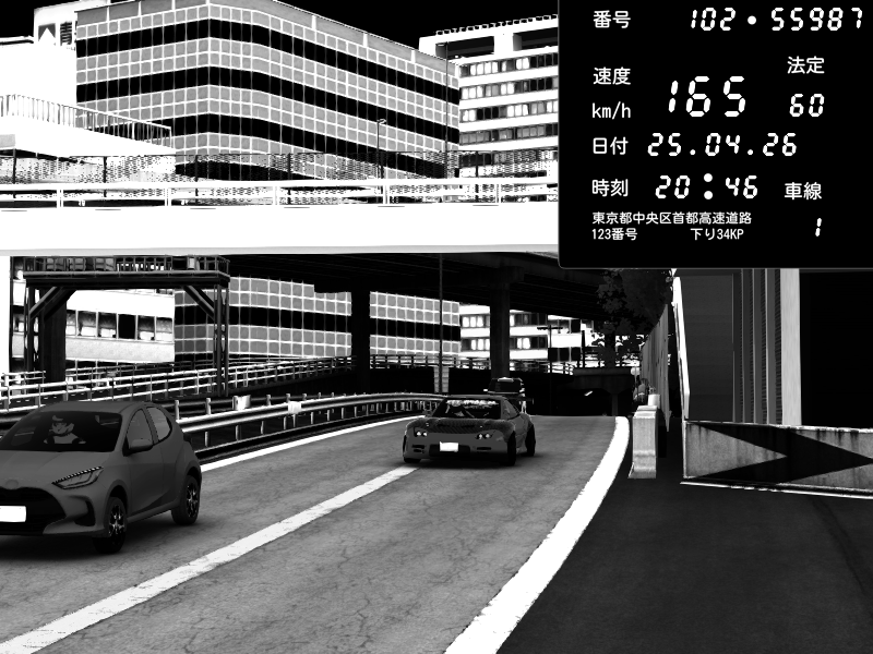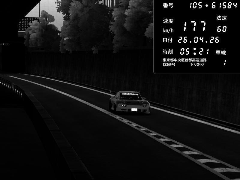 | 2026/04/25 19:58 | C1外回り 新富町 | 191 / 60 km/h | Pixy | Pit Road M - Mitsubishi GTO Twin Turbo | CAPTURE |