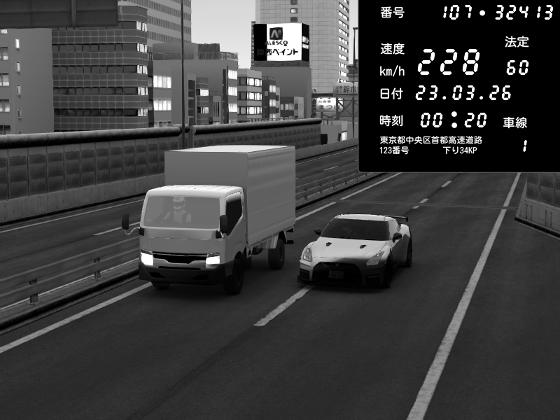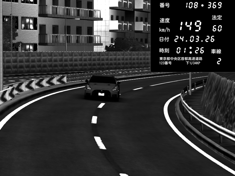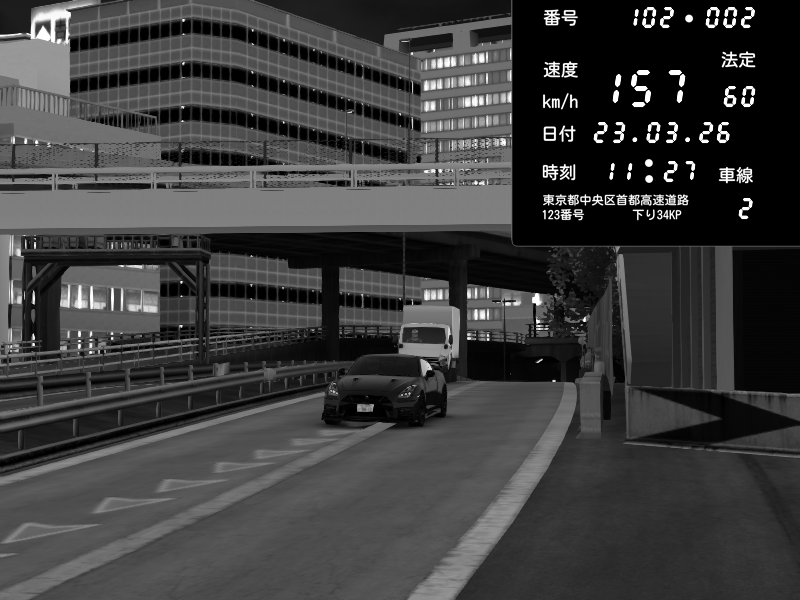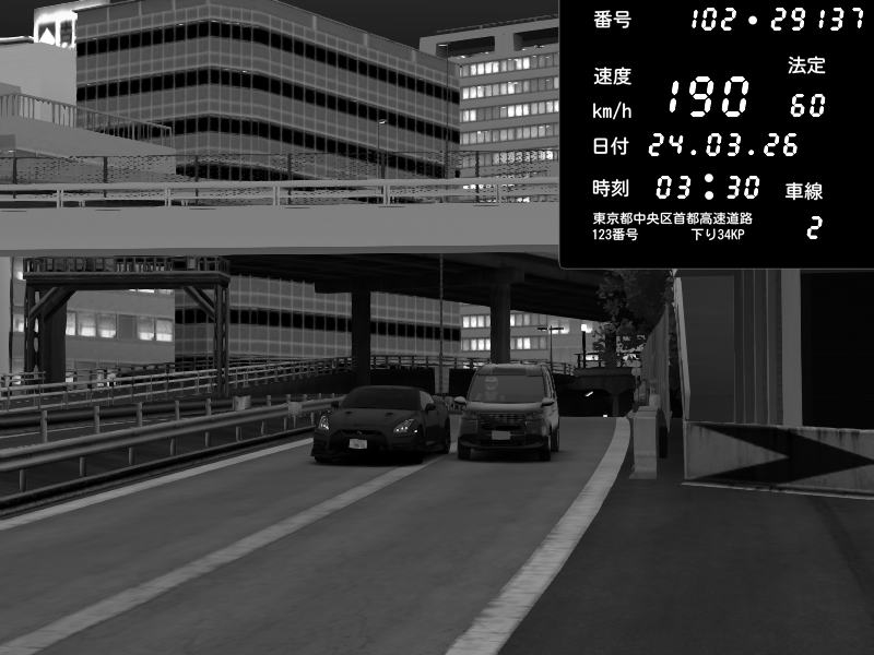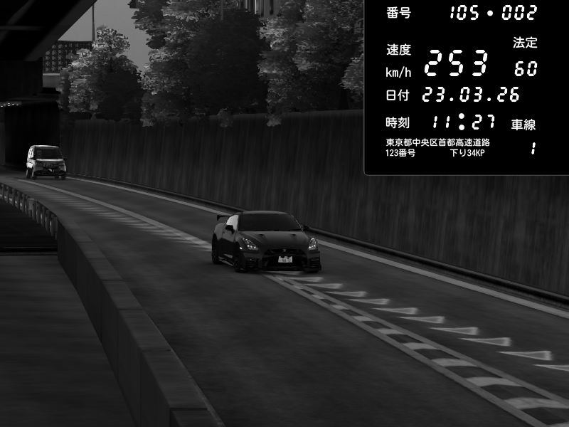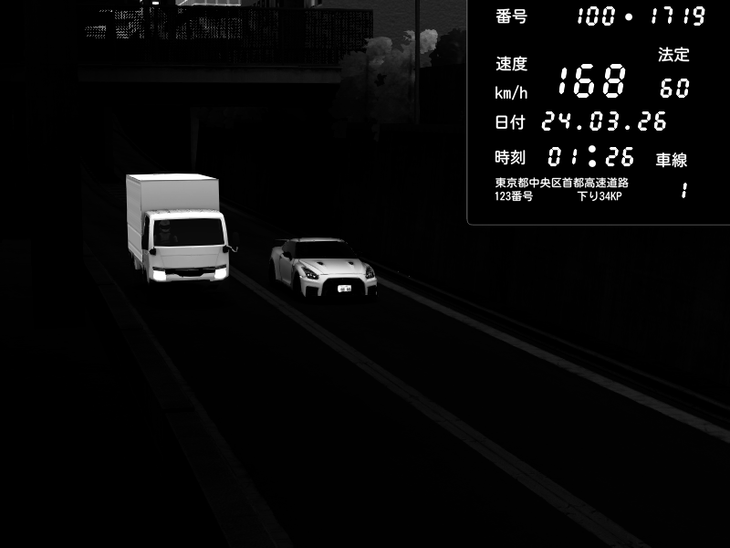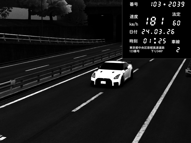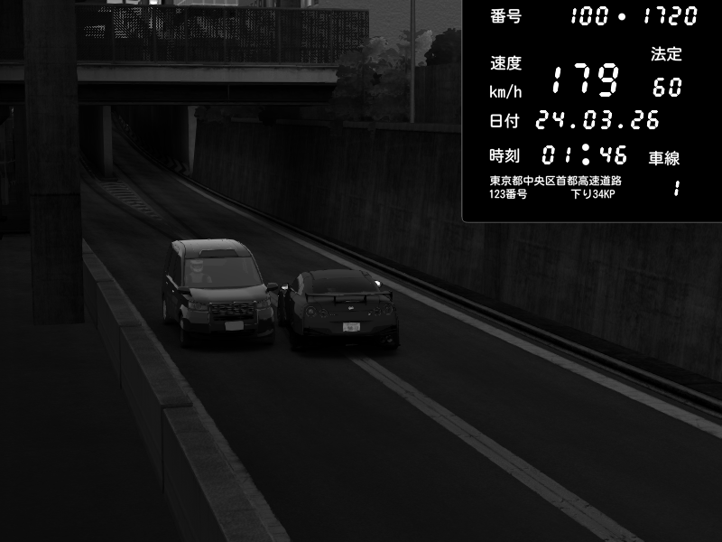 | 2026/03/24 03:30 | C1外回り 新富町 | 190 / 60 km/h | RiTZ | Nissan GT-R NISMO 2017 | CAPTURE |