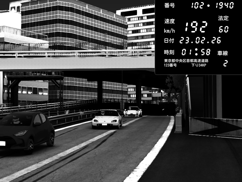 | 2026/02/23 05:58 | C1外回り 新富町 | 189 / 60 km/h | Player | Honda S2000 (AP2 - Legendary) | CAPTURE |