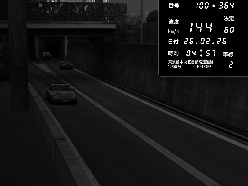 | 2026/02/26 04:57 | C1内回り 京橋 | 144 / 60 km/h | EXIA | Honda S2000 (AP2 - Legendary) | CAPTURE |