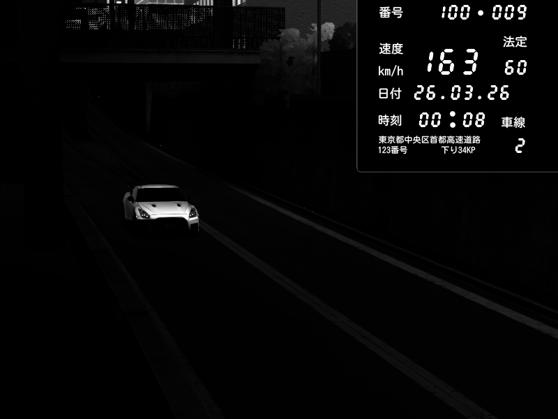 | 2026/03/26 00:08 | C1内回り 京橋 | 163 / 60 km/h | Nissan GT-R NISMO 2017 | CAPTURE |