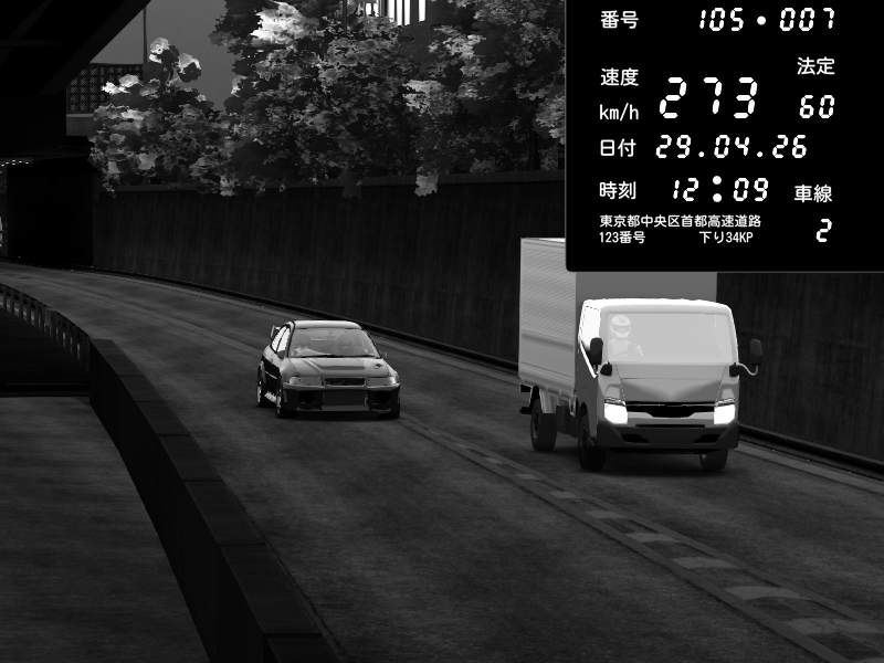 | 2026/04/29 12:09 | C1外回り 京橋 | 273 / 60 km/h | Mitsubishi Lancer Evolution V Wangan Spec | CAPTURE |