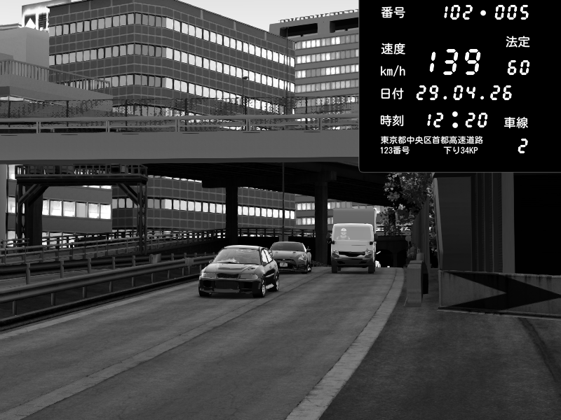 | 2026/04/29 12:20 | C1外回り 新富町 | 139 / 60 km/h | Mitsubishi Lancer Evolution V Wangan Spec | CAPTURE |