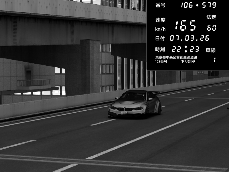 | 2026/03/07 22:14 | C1内回り 銀座 | 191 / 60 km/h | BMW M4 crash.Sp Varis Widebody | CAPTURE |