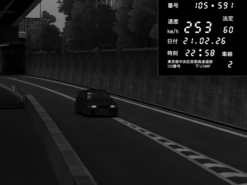 | 2026/02/21 22:58 | C1外回り 新富町 | 127 / 60 km/h | Mitsubishi Lancer Evolution V Wangan Spec | CAPTURE |