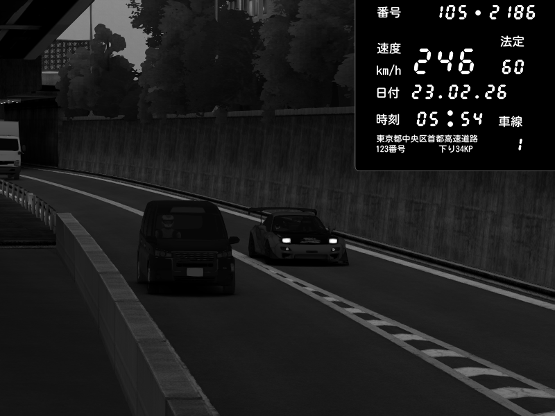 | 2026/02/23 05:28 | C1内回り 竹橋JCT | 123 / 60 km/h | Mazda RX-7 FD3S FEED Afflux GT3 | CAPTURE |