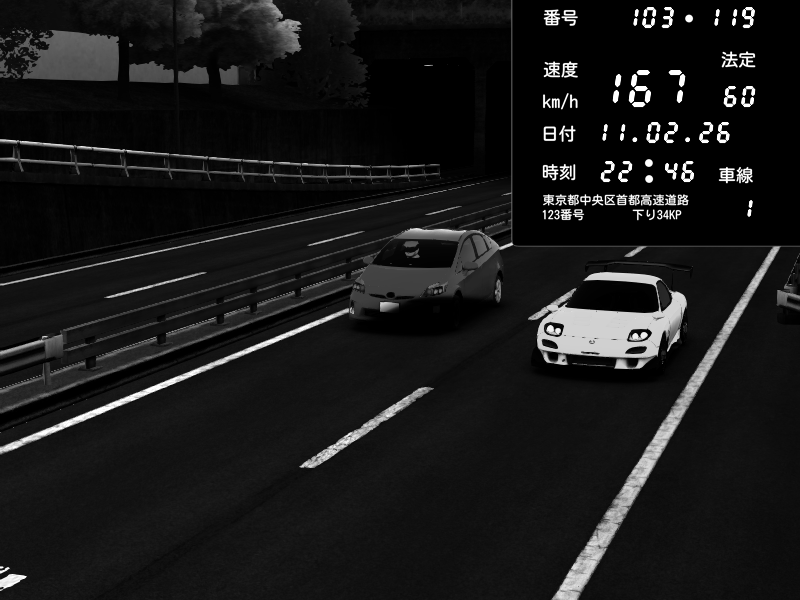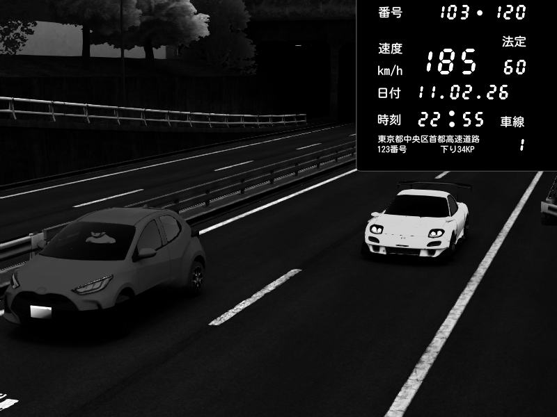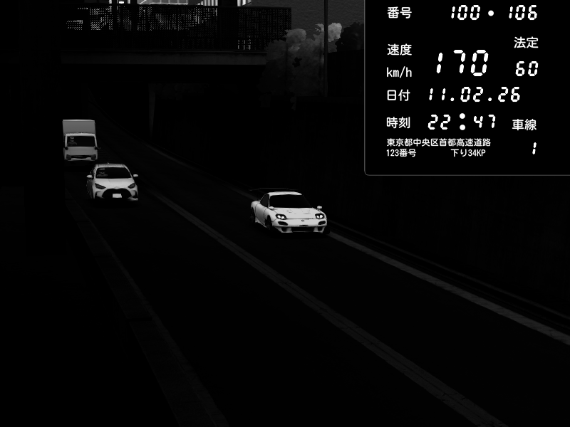 | 2026/02/11 22:47 | C1内回り 京橋 | 170 / 60 km/h | Mazda RX-7 FD3S RE Amemiya | CAPTURE |