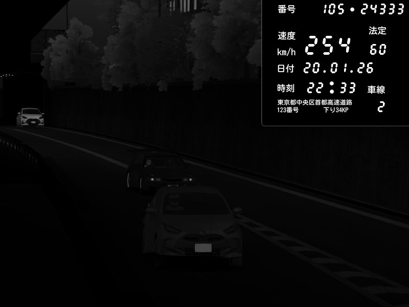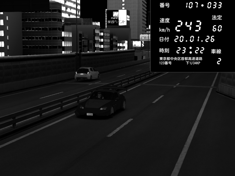 | 2026/01/20 22:33 | C1外回り 京橋 | 254 / 60 km/h | Nissan Skyline GTR R33 (S3 - Wangan) | CAPTURE |