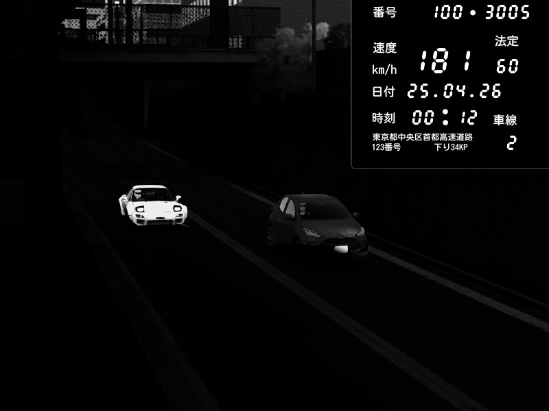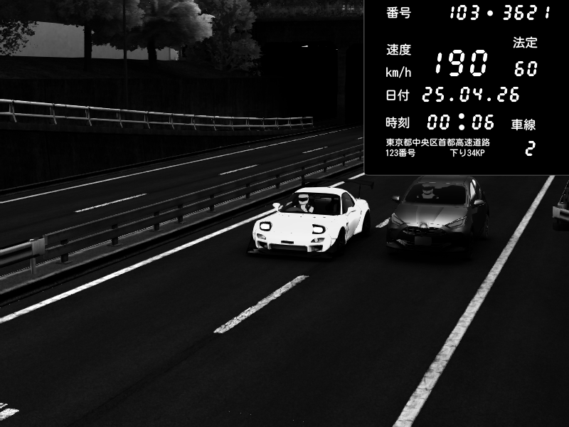 | 2026/04/25 00:06 | C1内回り 銀座 | 190 / 60 km/h | Mazda RX-7 FD3S FEED Afflux GT3 | CAPTURE |