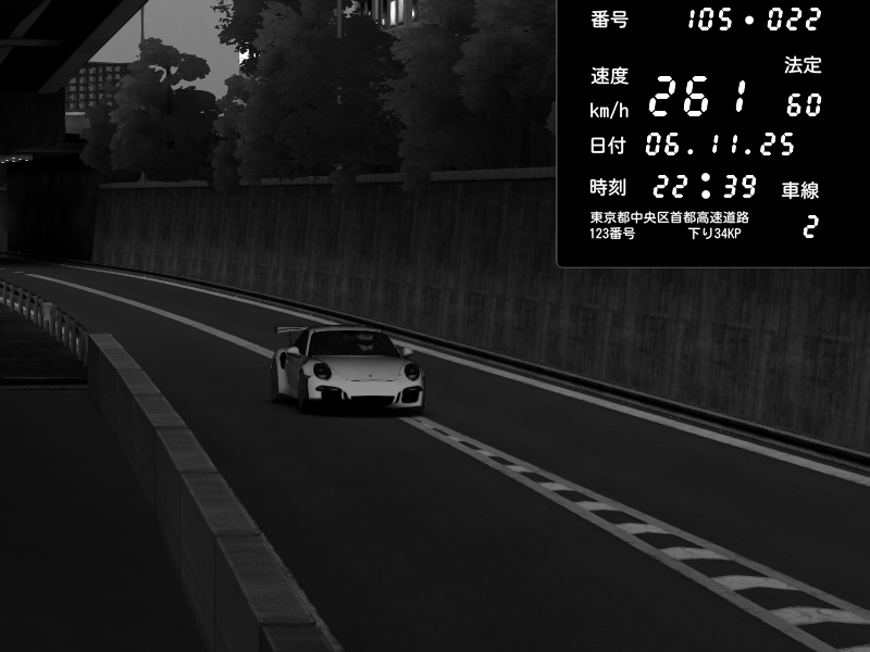 | 2025/11/06 22:39 | C1外回り 京橋 | 261 / 60 km/h | Porsche 911 GT3 RS | CAPTURE |