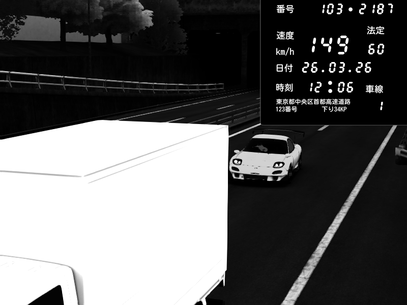 | 2026/03/26 12:06 | C1内回り 銀座 | 149 / 60 km/h | Mazda RX-7 FD3S RE Amemiya | CAPTURE |