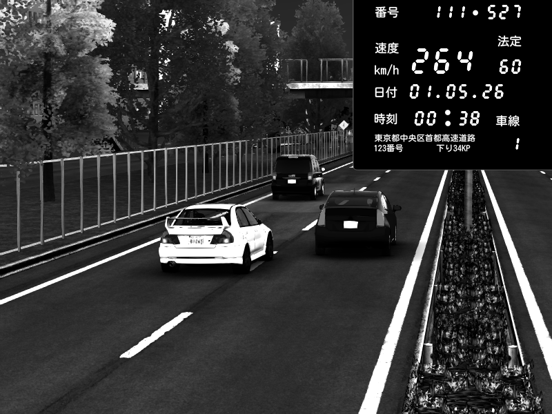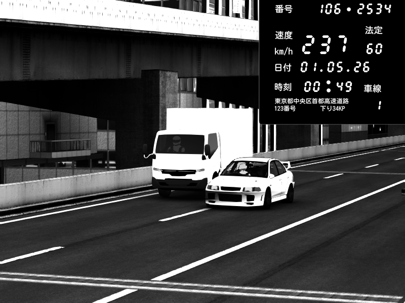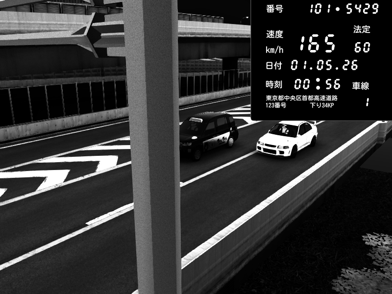 | 2026/05/01 00:56 | C1内回り 竹橋JCT | 165 / 60 km/h | Mitsubishi Lancer Evolution V Wangan Spec | CAPTURE |