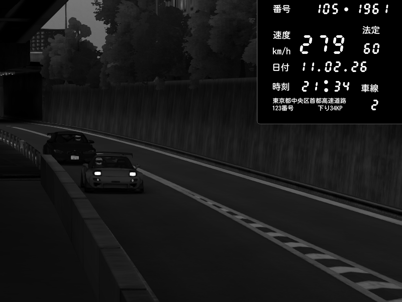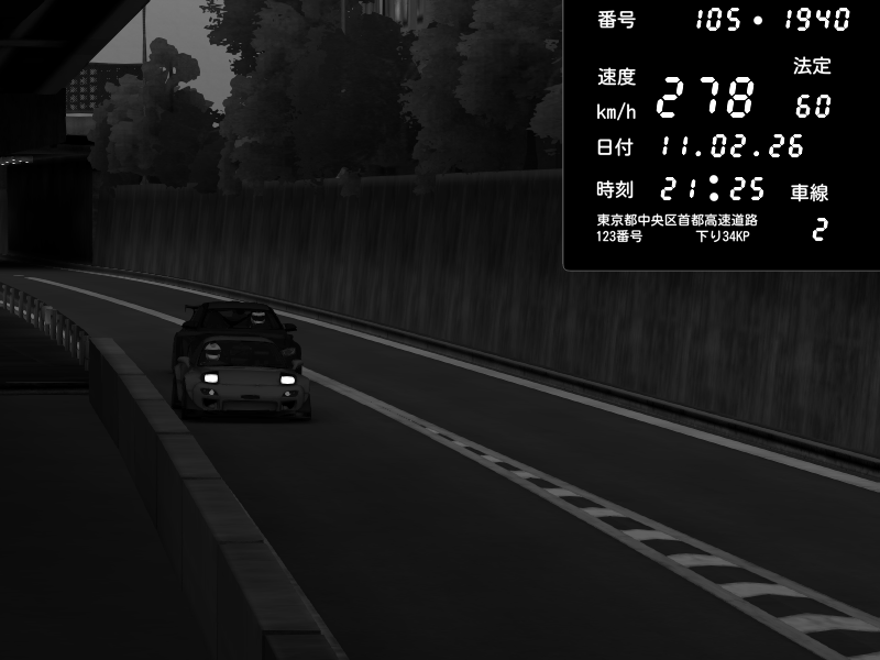 | 2026/02/11 21:20 | C1外回り 京橋 | 102 / 60 km/h | Mazda RX-7 FD3S FEED Afflux GT3 | CAPTURE |