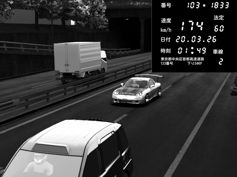 | 2026/03/20 01:49 | C1内回り 銀座 | 174 / 60 km/h | Mazda RX-7 FD3S RE Amemiya | CAPTURE |
