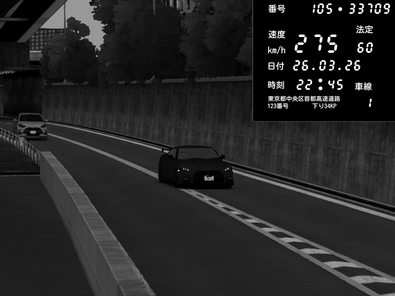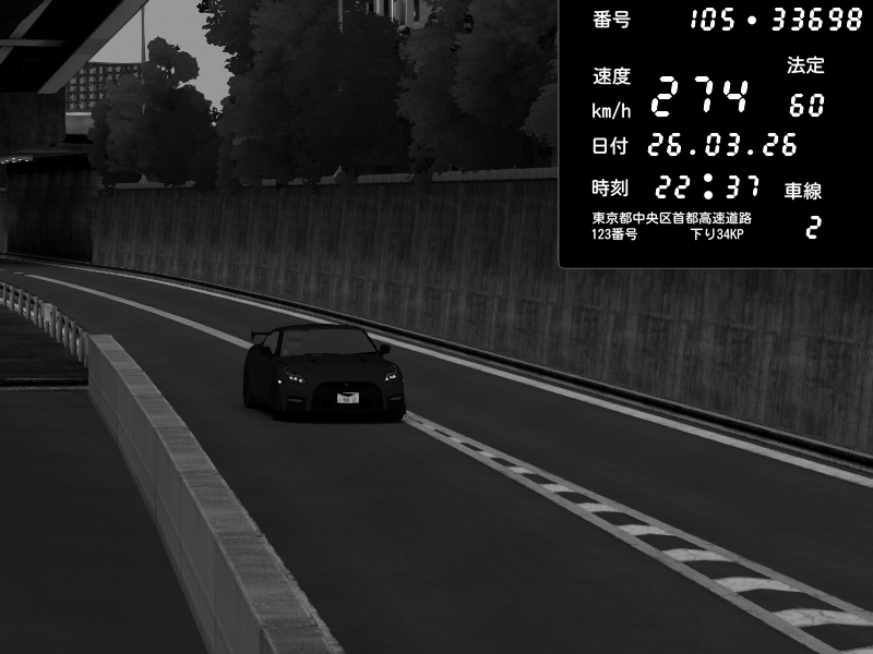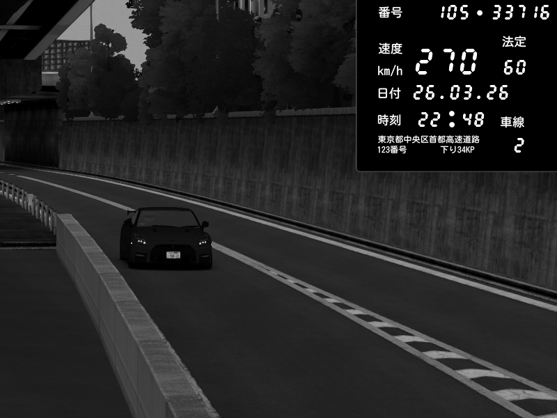 | 2026/03/26 22:48 | C1外回り 京橋 | 270 / 60 km/h | Nissan GT-R NISMO 2017 | CAPTURE |