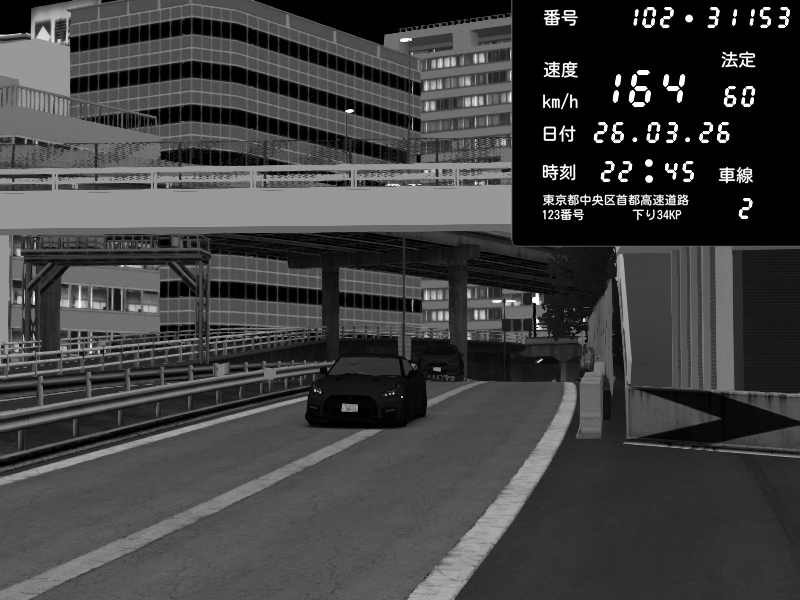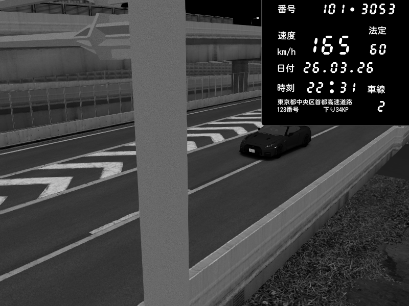 | 2026/03/26 22:31 | C1内回り 竹橋JCT | 165 / 60 km/h | Nissan GT-R NISMO 2017 | CAPTURE |