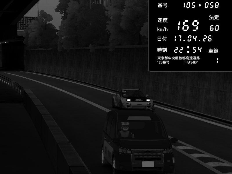 | 2026/04/17 22:28 | C1外回り 京橋 | 152 / 60 km/h | Nissan GT-R NISMO 2017 | CAPTURE |
