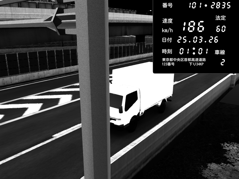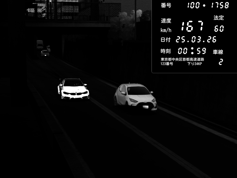 | 2026/03/25 00:59 | C1内回り 京橋 | 167 / 60 km/h | BMW M4 crash.Sp Varis Widebody | CAPTURE |