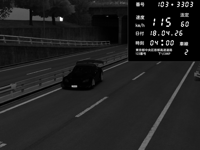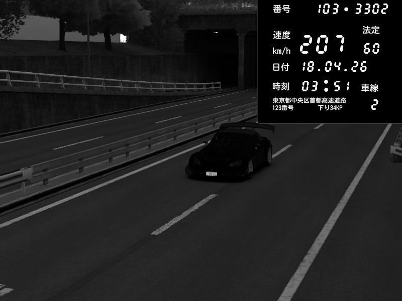 | 2026/04/18 03:51 | C1内回り 銀座 | 207 / 60 km/h | Honda S2000 Turbo GT1 Amuse (AP1) | CAPTURE |