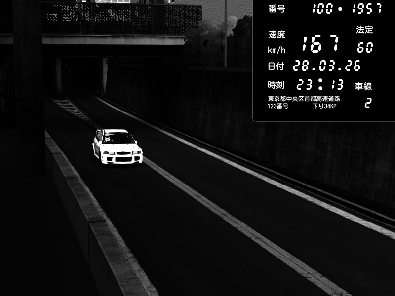 | 2026/03/28 23:22 | C1外回り 芝公園 | 230 / 60 km/h | Mitsubishi Lancer Evolution V Wangan Spec | CAPTURE |