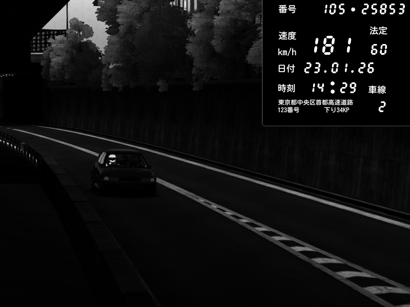 | 2026/01/23 14:29 | C1外回り 京橋 | 181 / 60 km/h | Mitsubishi Lancer Evolution V Wangan Spec | CAPTURE |