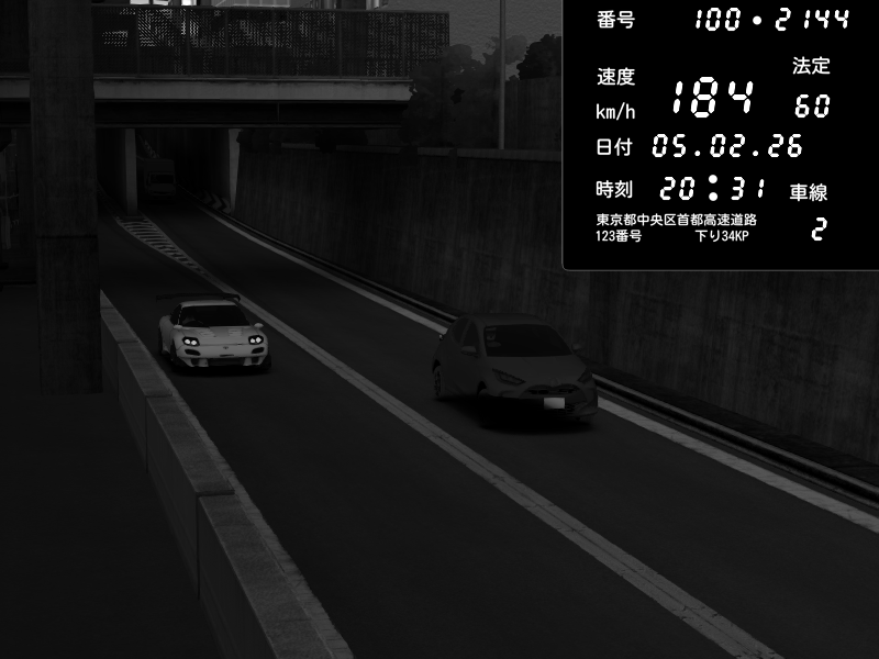 | 2026/02/05 20:31 | C1内回り 京橋 | 184 / 60 km/h | Mazda RX-7 FD3S RE Amemiya | CAPTURE |