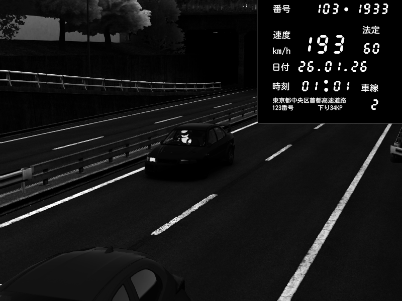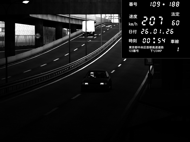 | 2026/01/26 01:01 | C1内回り 銀座 | 193 / 60 km/h | Mitsubishi Lancer Evolution V Wangan Spec | CAPTURE |