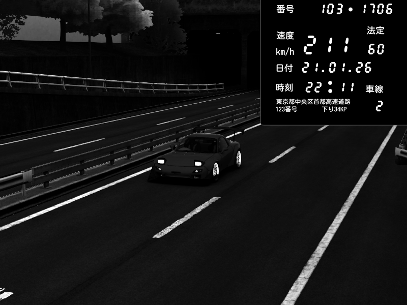 | 2026/01/21 22:13 | C1内回り 竹橋JCT | 206 / 60 km/h | Mazda RX-7 FD3S FEED Afflux GT3 | CAPTURE |