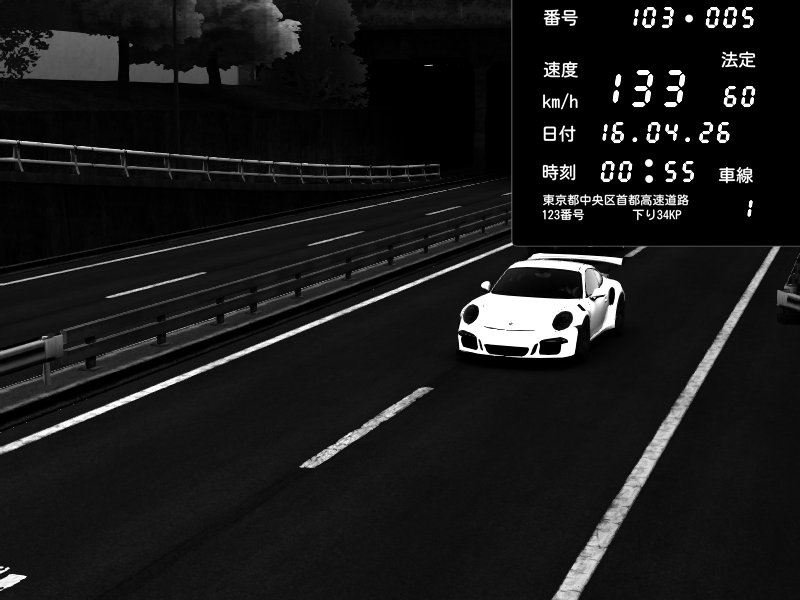 | 2026/04/16 00:56 | C1内回り 京橋 | 136 / 60 km/h | Porsche 911 GT3 RS | CAPTURE |
