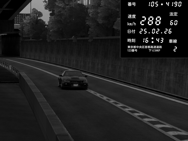 | 2026/02/25 16:43 | C1外回り 京橋 | 288 / 60 km/h | Nissan Skyline GT-R R34 Nismo Omori Factory S1 | CAPTURE |