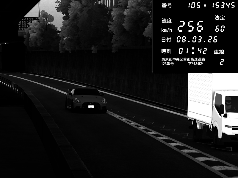 | 2026/03/08 01:42 | C1外回り 京橋 | 256 / 60 km/h | Nissan GT-R NISMO 2017 | CAPTURE |