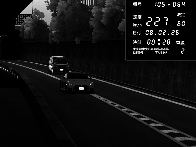 | 2026/02/08 00:28 | C1外回り 京橋 | 227 / 60 km/h | Nissan GT-R NISMO 2017 | CAPTURE |