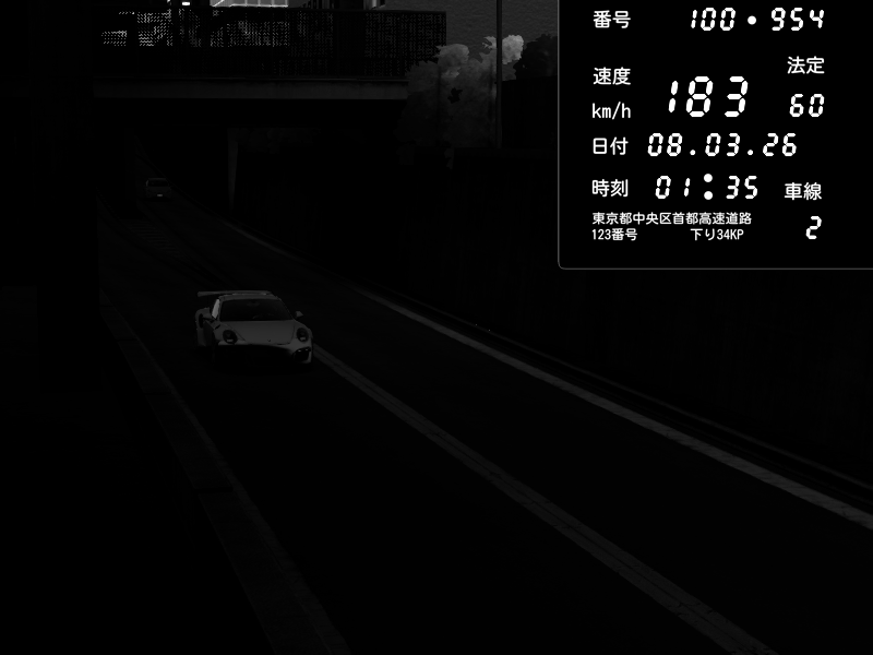 | 2026/03/08 01:35 | C1内回り 京橋 | 183 / 60 km/h | Porsche 911 GT3 RS | CAPTURE |