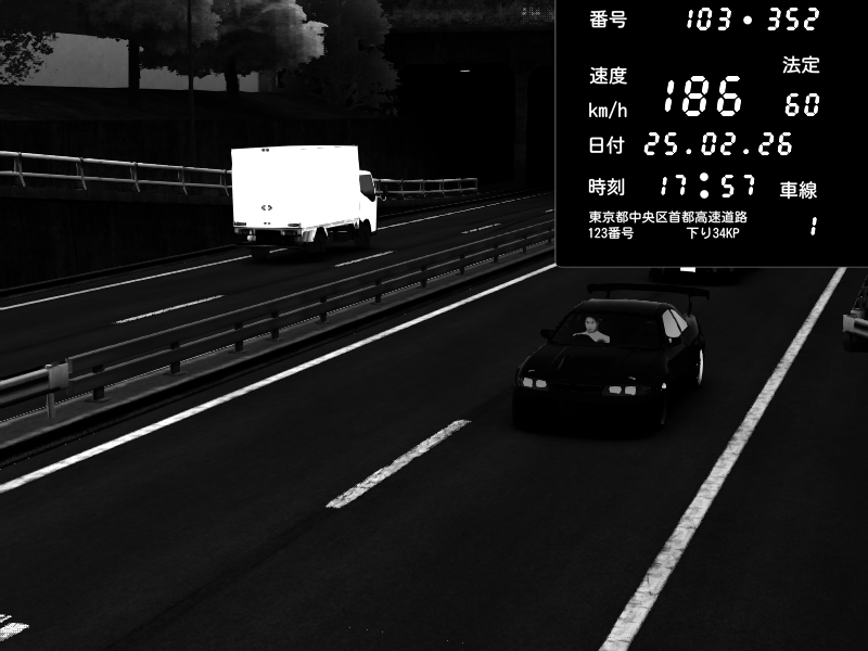 | 2026/02/25 17:56 | C1外回り 新富町 | 100 / 60 km/h | Nissan Skyline GTR R33 (S3 - Wangan) | CAPTURE |