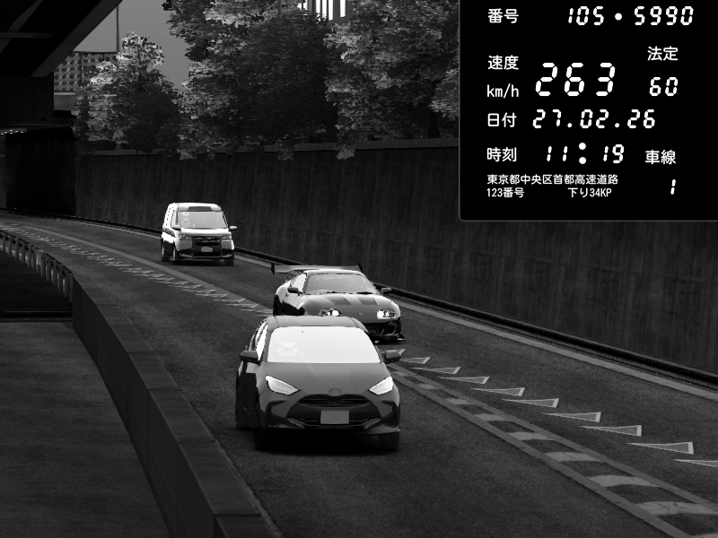 | 2026/02/27 11:19 | C1外回り 京橋 | 263 / 60 km/h | Toyota Supra MKIV Time Attack | CAPTURE |
