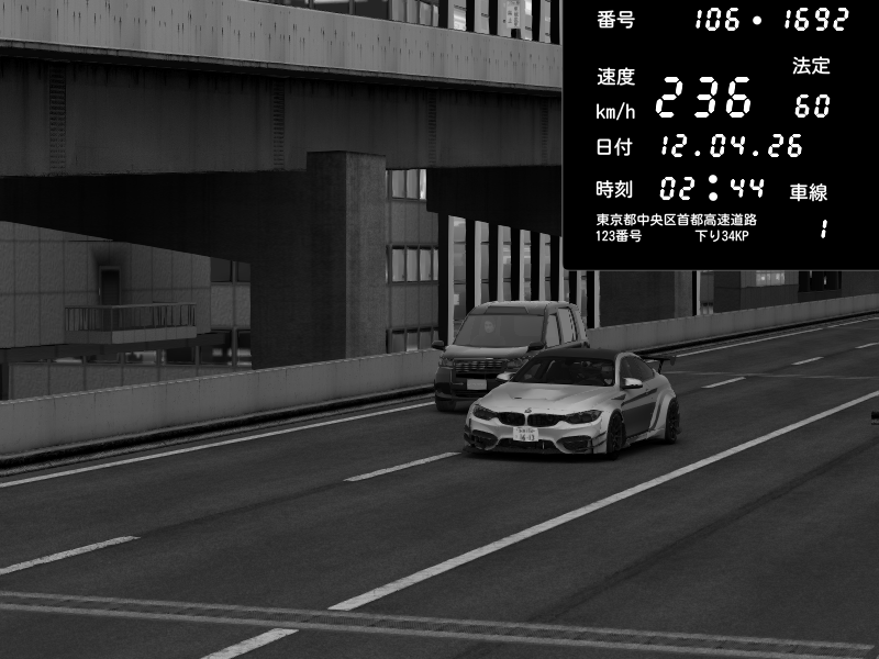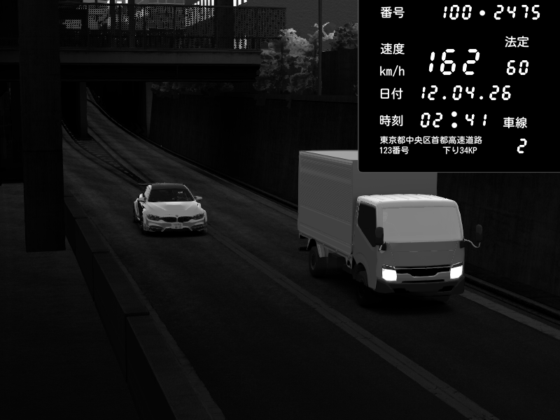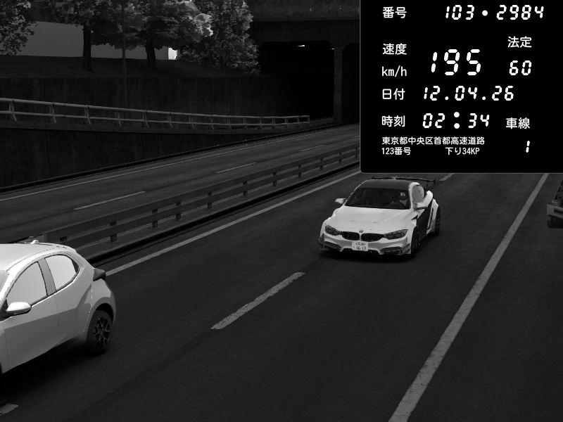 | 2026/04/12 02:34 | C1内回り 銀座 | 195 / 60 km/h | BMW M4 crash.Sp Varis Widebody | CAPTURE |
