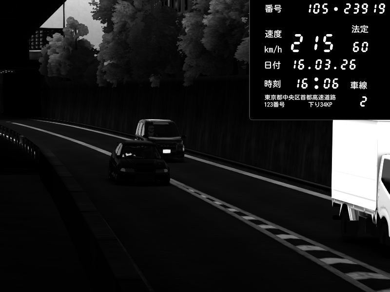 | 2026/03/16 16:03 | C1外回り 新富町 | 163 / 60 km/h | Mitsubishi Lancer Evolution V Wangan Spec | CAPTURE |