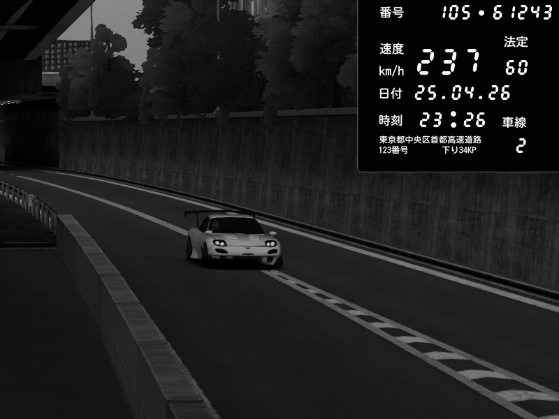 | 2026/04/25 23:26 | C1外回り 京橋 | 237 / 60 km/h | Mazda RX-7 FD3S RE Amemiya | CAPTURE |
