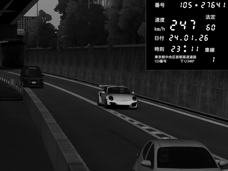 | 2026/01/24 22:57 | C1外回り 京橋 | 242 / 60 km/h | Porsche 911 GT3 RS | CAPTURE |