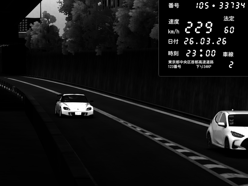 | 2026/03/26 23:00 | C1外回り 京橋 | 229 / 60 km/h | Honda S2000 (AP2 - Legendary) | CAPTURE |