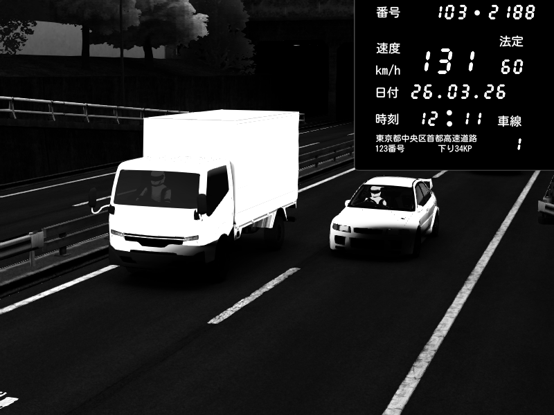 | 2026/03/26 12:16 | C1外回り 新富町 | 112 / 60 km/h | Mitsubishi Lancer Evolution V Wangan Spec | CAPTURE |