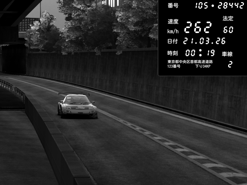 | 2026/03/21 00:19 | C1外回り 京橋 | 262 / 60 km/h | Mazda RX-7 FD3S FEED Afflux GT3 | CAPTURE |