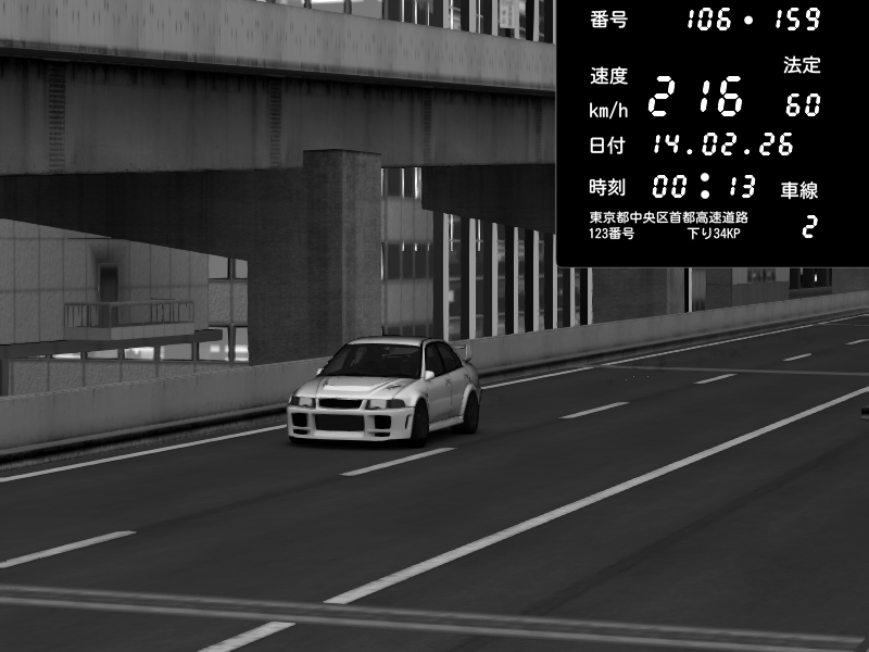 | 2026/02/14 00:13 | 9号下り 木場 | 216 / 60 km/h | Mitsubishi Lancer Evolution V Wangan Spec | CAPTURE |