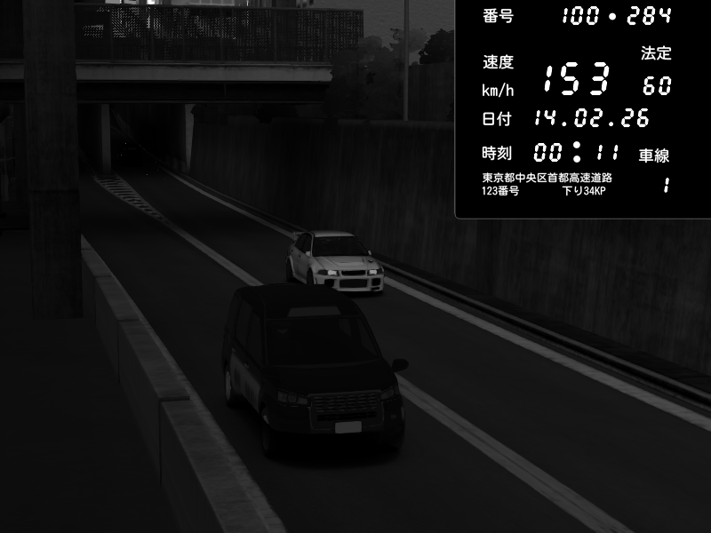 | 2026/02/14 00:11 | C1内回り 京橋 | 153 / 60 km/h | Mitsubishi Lancer Evolution V Wangan Spec | CAPTURE |