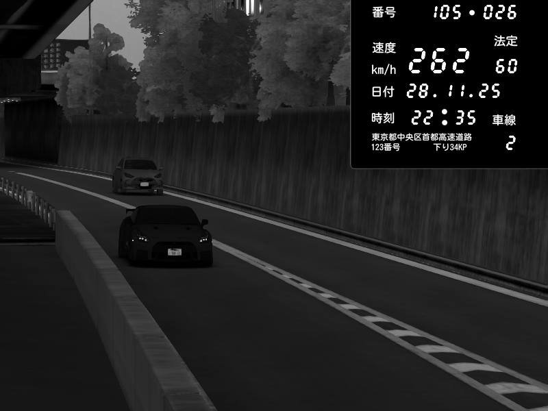 | 2025/11/28 22:35 | C1外回り 京橋 | 262 / 60 km/h | Nissan GT-R NISMO 2017 | CAPTURE |