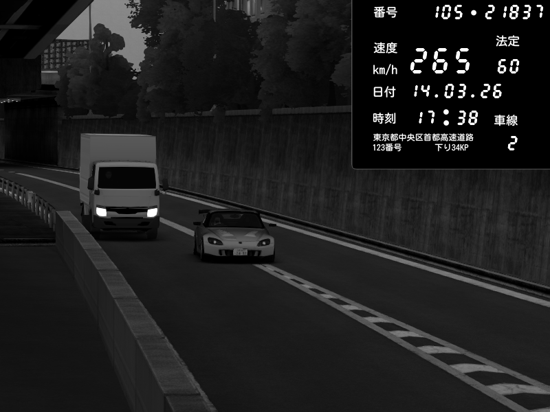 | 2026/03/14 17:38 | C1外回り 京橋 | 265 / 60 km/h | Honda S2000 (AP2 - Legendary) | CAPTURE |