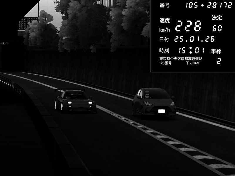| 2026/01/25 15:01 | C1外回り 京橋 | 228 / 60 km/h | Mazda RX-7 FD3S FEED Afflux GT3 | CAPTURE |