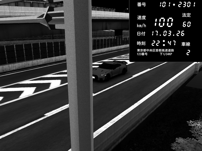 | 2026/03/17 22:47 | C1内回り 竹橋JCT | 100 / 60 km/h | Nissan GT-R NISMO 2017 | CAPTURE |