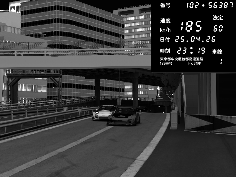 | 2026/04/25 23:19 | C1外回り 新富町 | 185 / 60 km/h | Mazda RX-7 FD3S FEED Afflux GT3 | CAPTURE |