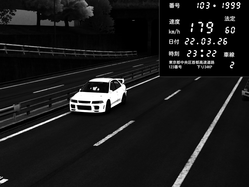 | 2026/03/22 23:22 | C1内回り 銀座 | 179 / 60 km/h | Mitsubishi Lancer Evolution V Wangan Spec | CAPTURE |